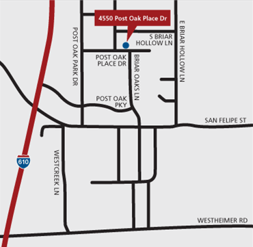 When exiting 610 Loop, go east on San Felipe, make a left on Briar Oaks Lane, and a right on Post Oak Place Drive. Our office can be most easily accessed if you enter on the East side of the building and take the elevators to the 3rd floor. Our suite (#320) is immediately to your left when you exit the East side elevator.